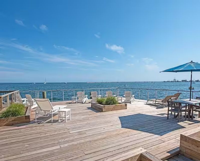 This newly renovated spacious unit is on the second level and has cathedral ceilings and exceptional water views in three directions capped off with an oversize deck. Bayshore 8 is located in Historic Provincetown. Situated in the quiet east end on the waterfront, it is just a short walk to the bustling center of town, yet far from the noise at night. You can leave your car in our private parking lot and stroll the streets to your heart’s content.